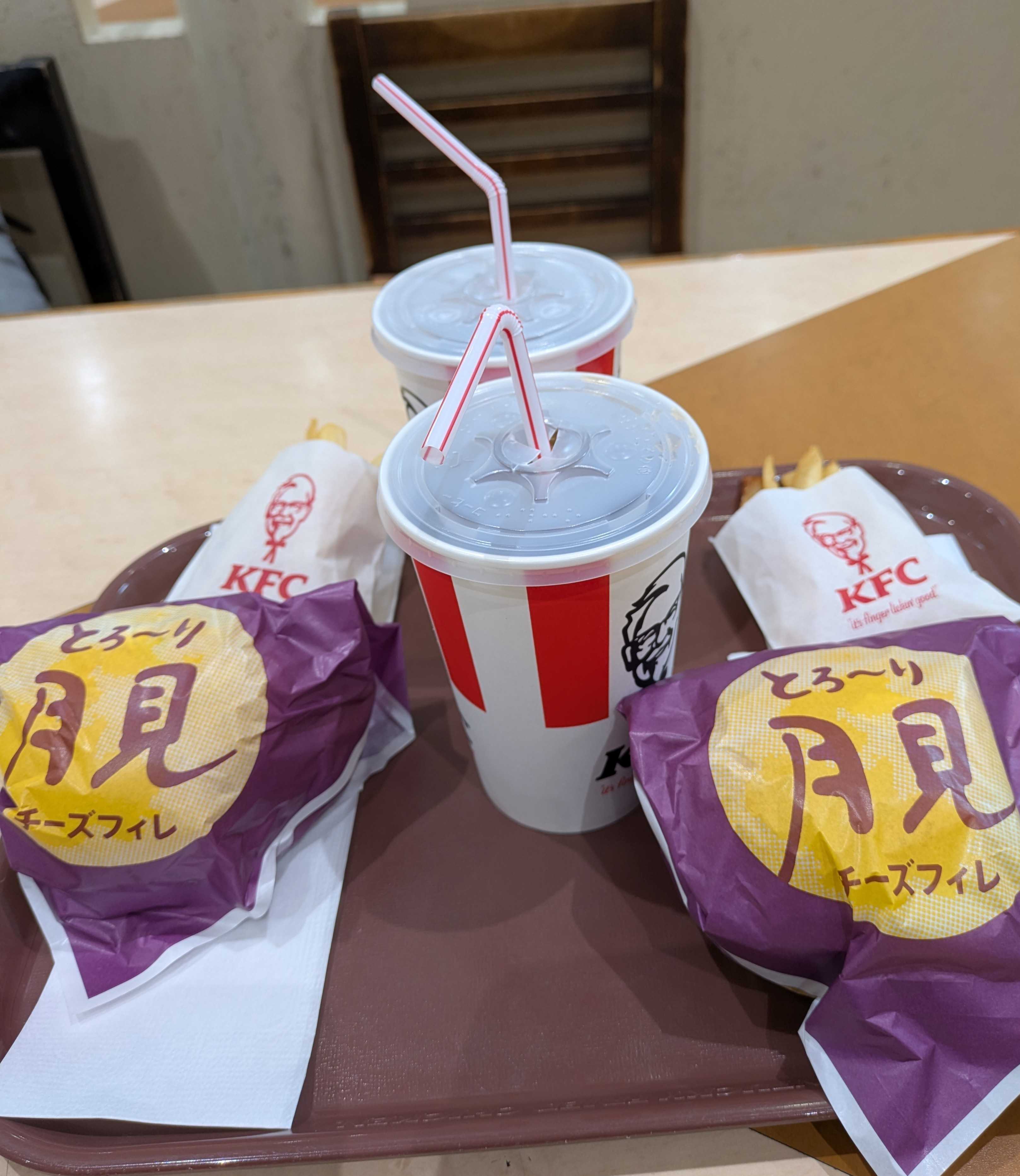 父と久しぶりにKFCへ。とろ〜り月見チーズフィレバーガー。半熟の月見と、チキンフィレとの相性が抜群で最高でした。