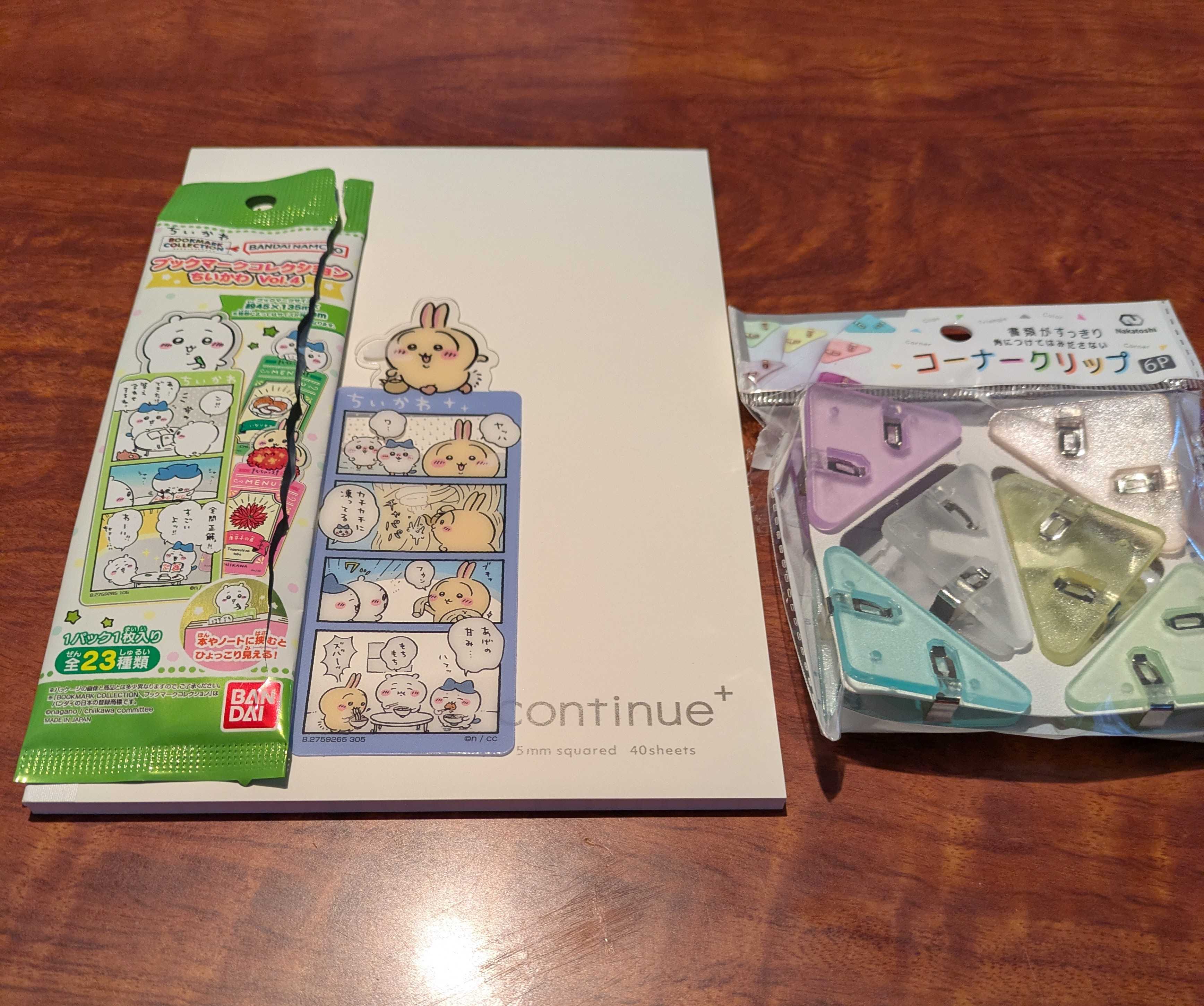 セリアで、コーナークリップとノート、ちいかわのしおりを買いました。