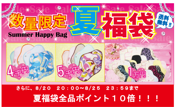本日20:00より!一周年感謝福袋発売赤字覚悟の超特福袋ですので、追加・再販は出来ません!(つぶれちゃいます・・・)感謝の気持ちをたっぷり込めた渾身のスペシャル福袋21,000円相当の商品が7000円引きの「14000円(税・送料込み)]泣きながら詰めております・・・お買い逃しのないようにGETしてくださいね布ナプキン専門店~ジュランジェ~