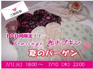 楽天内で、色々なイベントが開催日夜割引競争が激化する中。。。あまり割引されずに売れている商品があります。それが・・・「布ナプキン」です。なかなか安くなりませんそれが・・・なんと半額!!!手数料や梱包を考えたら利益なんて残りません80%や90%OFF!なんて出来るのは、海外で安く大量に作っているから☆布ナプキンは国内で丁寧に作られています。それを50%もオフしちゃうなんて・・・コレを機に1人でも多くの人が布ナプキンを知るきっかけになってくれたらいいなぁと願います・・・・衝撃!【50%OFF!】人魚姫 S ライト ライムグリーンのレースと水色サテンホルダー+プレーンセット初めての布ナプキンはこちらから♪なかなか安く買えない布ナプが!【50%OFF!】ジュランジェ・ショック布ナプキン一体型S(ライト)全面防水布入りで安心♪まずはこれで!
