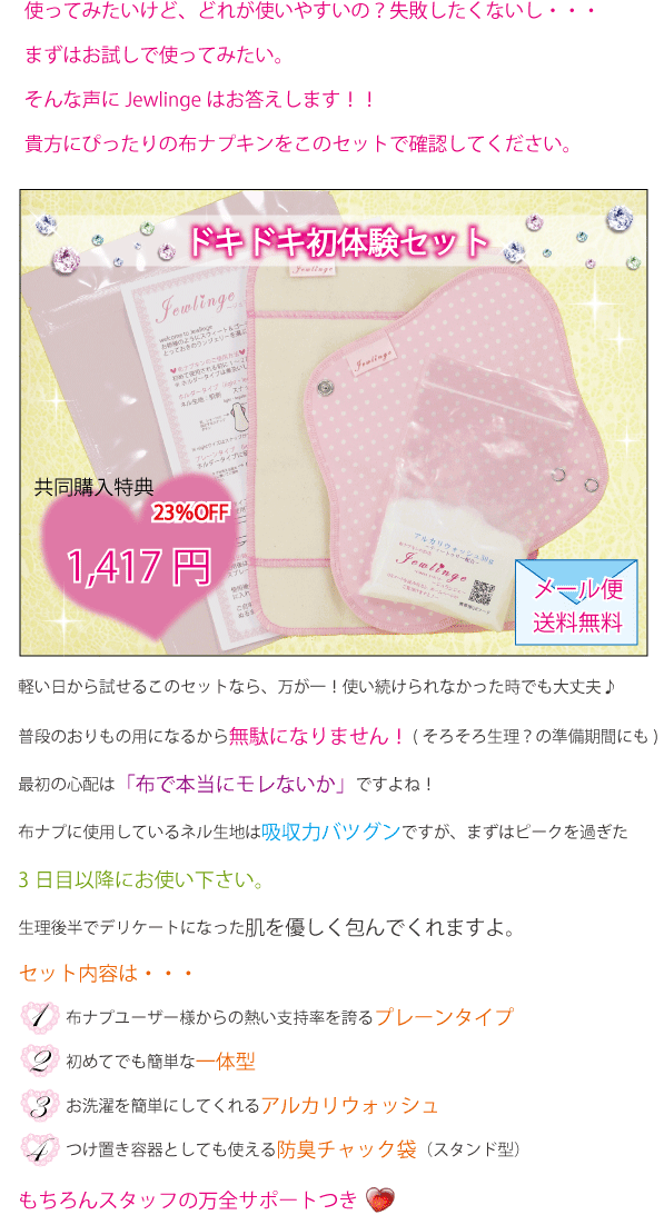 こんにちはジュランジェのゆうですお陰様で大好評のお試しセット☆布ナプ初心者さまでも安心して使えます市販のおりものシートは長時間していると、ムレて気持ち悪い・・・と、いう方にも是非是非オススメしたいセットです残り少なくなってきましたので、早めにチェックしてくださいね♪Jewlinge