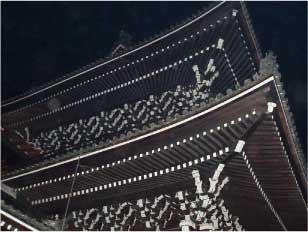 ねねの道から高台寺までは、枚数も少ないのですがオーブは全く写っていなかったので、清水寺では本当にビックリしました。オーブを写したのは生涯で2回目。1回目は、目黒雅叙園内の目黒美術館です。(螺鈿の部屋で移したのですがこの時は、友達を写したのでびっくりしてそのまま消しちゃったのです。)清水寺からの折り返しの時も母は、ズンズン。はぁ・・・知恩院へ戻る途中、下り坂で人を抜かす母を見て抜かされたおじさんは、不快だったようで「ああ~もう!]と言ってました。はい・・その通りですね。ゆっくりした時間を楽しむのがいいと、私も思います(^^;)新年早々すまんね、おじさん。「もう、下りは人が来るから抜かすのは止めて」と言っても「人がきてない時にやってる」とか「だって立ち止まってる方が悪い」とか言って手におえずちょっと険悪なムードに・・・(^^;)家の母も時間を楽しむ人だったのですが一体どうした事でしょう?やはり時間が気になるのかな・・・それでも清水寺では、結構ゆっくりしていたようで知恩院についた頃には既に除夜の鐘がなっていました。「並んで頂いて、今1時間待ちです」と言われ、「ひ~1時間かあ・・・でもこれが目的だもんねぇ」と言う会話をしながら三門の道を登ります。知恩院三門もパチリう・・・ここにも・・・その上、立派な三門を綺麗に写したく頑張ったのですが、発光禁止で写そうと思ったら、シャッターがきれない;;;そんな状態だったのに、なんと知恩院に入るとオーブが写る事は、全くありませんでした。清水寺の時も私は、清清しいなあと思っていたのですが、知恩院に入るともっと清清しい空気を感じていました。時間は、11:30を回っていて実際は、空気が冷えていたから清清しく感じたのかも知れませんwww煌々とした月と御影堂がとても美しくて、重厚感の中にも母親を思わせるようなやさしさを感じました。(なぜかは全然判りません(^^;)所詮私の表現力なんてこんな物www)御影堂です。凄い人の列でしたが、東京と違って落ち着いて並んでいます。静かな時を刻み続けている所にこちらの人たちの人柄を見たような気がします。これは唐門の一部です。知恩院の除夜の鐘は、重く、しかし、空気を浄化する様な心を洗われる様な音色でした。お坊さん達が突くタイミングを合わせる声掛けは、とても活気がある感じで、この声掛けと重厚な鐘の音が凄く良かったです。鐘突きをうまく撮れたのはよかったのですが、ここでも5突き以内で出てくださいといわれ、時間を感じる余裕はなくwww私たちは、3突きで移動しました。(フラッシュたいたりしちゃダメって言われてたのに、興奮してすっかり忘れていました;;;)そんな慌しい中でも除夜の鐘は、重厚で清清しく、母も満足していました。私達が、八坂神社の脇の道から帰る頃更に混雑はましていて凄い事になっていました。これから、益々人が増えるそうです。「知恩院の除夜の鐘」「ちおんいんのじょやのかね」なんか言葉さえ音がいいですねwww集合場所に帰る途中、新年を向かえ、慌しく、新年の挨拶を母とし合いました(^^;)集合場所に帰る途中で見た建物。随所にこういう建物があるのですね・・・写真は、南座です。南座の下の駅は、トイレが改札内にあるのですが駅員さんに改札内か確認して、諦めて別のトイレを探そうとしたら、改札内のトイレに入らせてくれました。やさしい~~駅員さんありがとうございます~~~ところで・・・知恩院は、いつもこんなに混むものなの?添乗員さんの話では、今年は、特に人出が多いようです。知恩院では、「元祖法然上人800年大遠忌」と書いてあるので今年の行事かと思ったら、大遠忌は、2011年でした。今年ではありませんでしたが、今年は5年毎の節目の年だそうで、最後の節目の年なので結構、意味のある年なのかもしれません。「知恩院」のホームページhttp://www.chion-in.or.jp/index.html