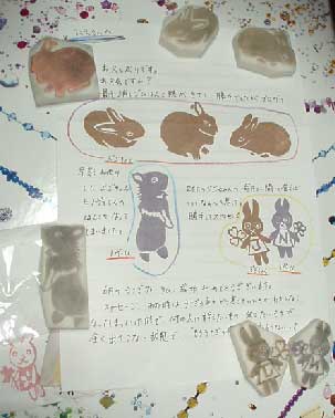 ただいま23:55。書いている間にジジの命日になります。ヘッダには8/21って書いているのですが、実際に死んでしまったのは、8/20です。去年は、いけなかったけど、今年は、墓参りに行きたいと思います。ジジのお墓は、柿の根元なのでお墓は、柿ですが。そんな、波長を感じてくれたのかな?ジジちゃんの命日に間に合うようにとみうさんから、ステキなプレゼントを頂きました。ジジ&ノヴァの消しゴムハンコですきゃ~!激似です(^^)。かわいい~ジジですノヴァです写真からおこしてくれたそうですが、本当にセンスいいですね(*^^*)こちらは、オリジナルイラストのハンコ。これもすごくかわいい!封筒にあったこの子は、しろちちゃんかな?味のあるいい感じのハンコですね~こういう作品を見ると燃えるというか、自分でも凄く作りたくなります。でも、こんなによく出来ないかな(^^;)あ、もう20日です。お手紙はジジにも見せようと思います。ジジの事は思い出すと後悔の事が多くて、人に話すときは嬉しい思い出より後悔と寂しさの涙のが多いのですが。そして未だに泣いちゃっているし。でも、ジジは今でも大事な私のうさぎです。