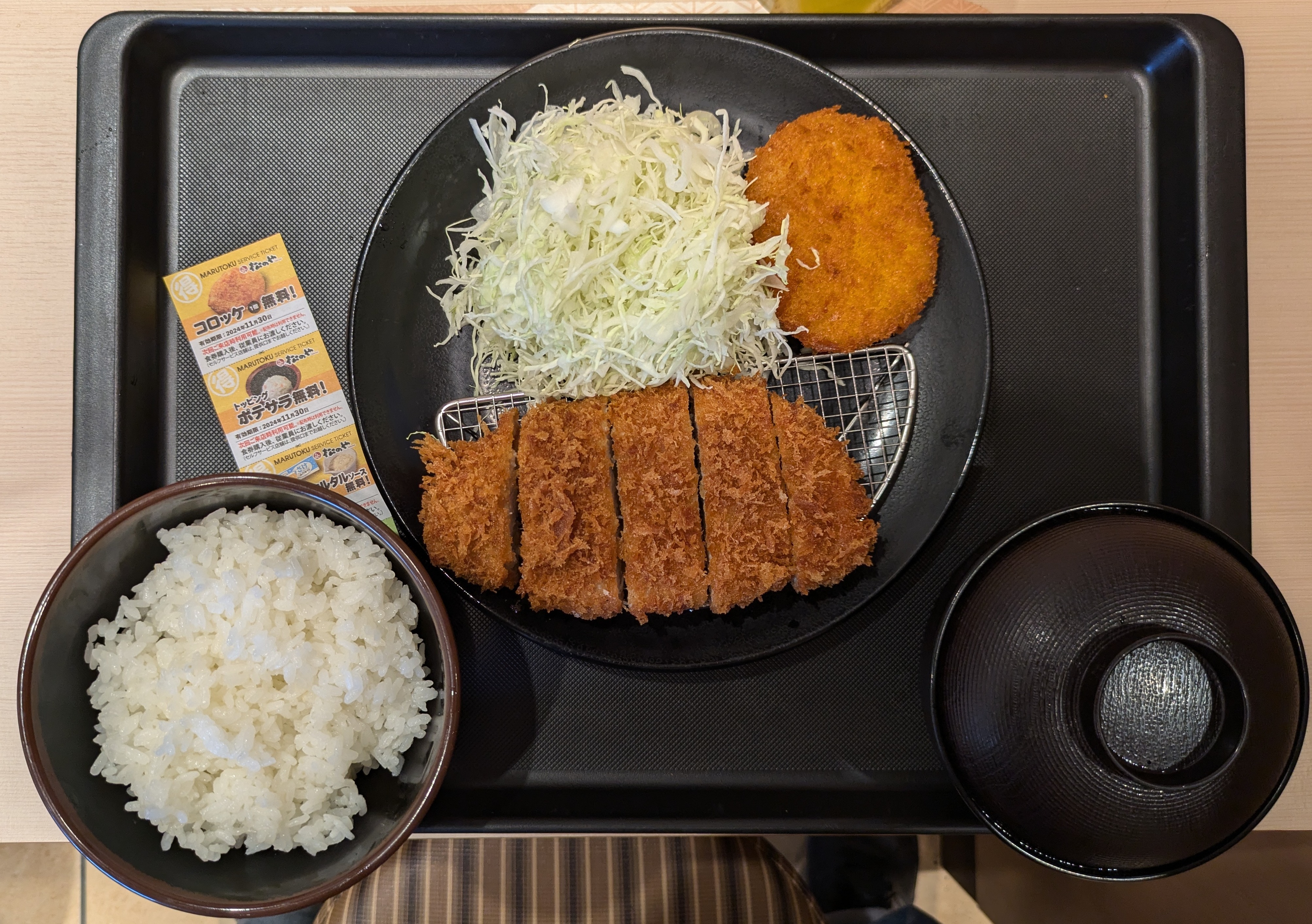 出来上がったロースかつ定食(クーポン割引)+サービス券のコロッケ