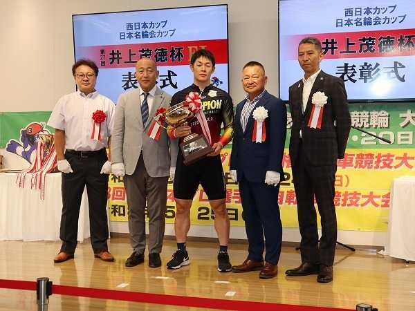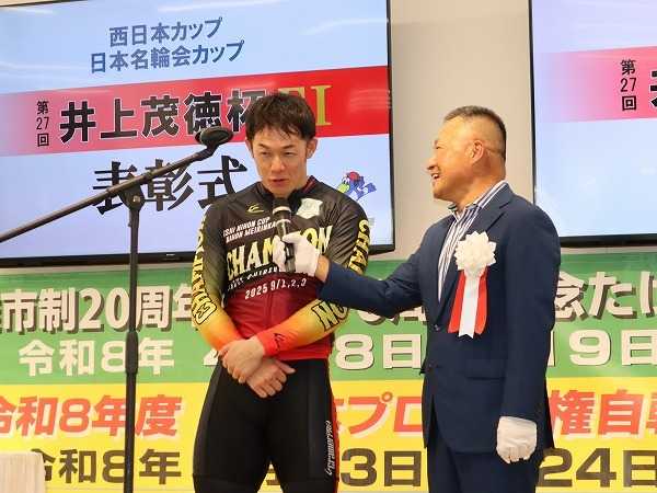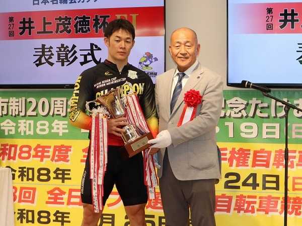 一般社団法人日本名輪会 代表理事でもあられ今回の冠タイトル「井上茂徳杯」の鬼脚 井上茂徳さんと優勝の山田英明選手