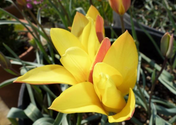 Stay home とはいえ、庭先に咲いているお花位はちゃんと見てあげないと…。見頃を迎えたチューリップ。キャノン7Dにマクロレンズを装着して撮影しようとしたところ、Err表示が出てシャッターが切れない。レンズとの通信エラーと表示出るがAFはちゃんと動くし動画撮影もOK。さてはレンズの絞り機構の故障?という訳でコンデジの登場。マクロ撮影には一眼レフよりコンデジの方が楽だったりする。品種は、葉が細いのが特徴の原種系ミニチューリップのクリサンサ(クルシアナクリサンサ)ぱっと見、チューリップに見えない。
