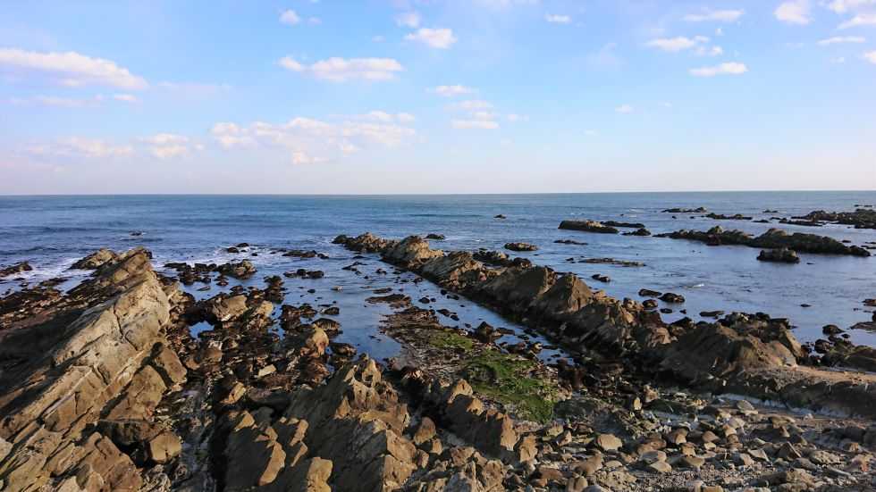 茨城県ひたちなか市にある平磯海岸は水戸の自宅から阿字ヶ浦の磯崎漁港に行く途中に位置する。磯崎漁港は私の釣りのホームグラウンド。釣りに行く途中、車窓から平磯海岸を横目に見て、その日の波の状態を確認するのが常だった。けれど、ここ1年、コロナで釣りに行く機会はすっかり失なわれてしまっていた。出来れば乗っ込みのシーズンには釣りに行けるようになって欲しい。さて、平磯から磯崎にかけては白亜紀の地層によって出来た岩場が連なっている。国内で白亜紀の地層が露出しているのは国の天然記念物に指定されている千葉県の犬吠埼とここ平磯海岸だけらしい。こちらは国ではなく、天然記念物に指定されている。アンモナイト、モササウル ス、ヒタチナカリュウなどの化石も発見されていて、時折、磯遊びや潮干狩りの人たちに交じって化石収集家を見かけることがある。斜めに傾いた地層が織りなす岩場の不思議な景観もなかなか見ごたえがあり、7,500万年前の太古の地球に思いをはせることが出来る。