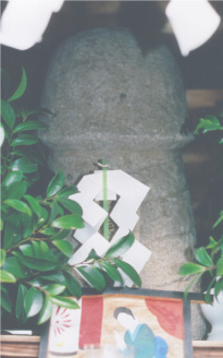 金精神には、自然石をそれらしく祀るものと、加工したものとがある。写真はリアルな加工品だ。手づくりの木製品を奉納する習慣が残る地域もある。金属製のものを、とくにカナマラ様と呼ぶ。