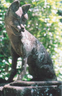 秩父山域は神犬信仰のメッカだ。ニホンオオカミは山神の化身、と山里では考えられてきた。このオオカミを、秩父の修験者は、日本武尊を遭難から救助した霊犬として、神に昇格させた。神社の狛犬は境内を警護する霊獣、稲荷のキツネは神の使い。だが、このオオカミは「大神」であって、同じように境内に置かれても格が違う。その神名を大口之真神(おおぐちのまがみ)という。