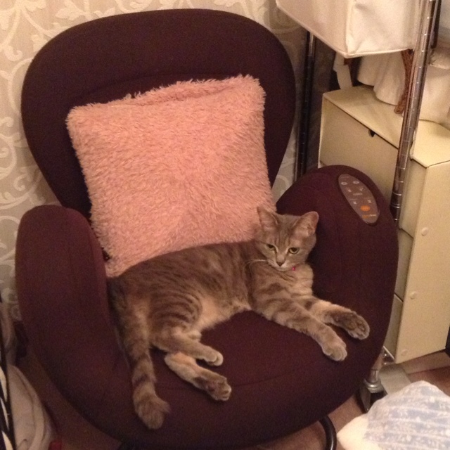 夕食に姿を見せなかった我が家の長女猫のシノワさん、どこにいるのーと呼びながら探していたら、なんと私のマッサージ椅子にちゃっかりと陣取っていました^_^ なぁに?と、ここに居るのが当然のように優雅に横たわったまま動かない。 肝が座っているのか、厚かましいのかわかりませんが、なんかこっちが悪いことしてるみたいな気分になり、すいません移動してくださいっていいながら猫缶食べさせに連れて出ました。 も〜、なんでっ? 女王様のような余裕かましています☆