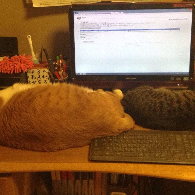 パソコンで作業中、デスクにどっかり横たわるお二方。 画面の目の前に( ̄▽ ̄) なんで? いやぁ、非常にやりにくい‥