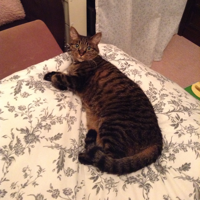 昨日に引き続き、今日は次男猫の寅。 男はつらいよ、の寅さんからとって名付けたんですが、本当に寅さんみたいに人懐こい性格です。 甘ったれです^_^ 昨日のシノワが居た椅子の前のベッドに今日は寅が鎮座しておりました。 もう、なんで猫たちは私のテリトリーに侵入したがるの〜?! まるで「羊のショーン」の主人宅に入り込みたがる羊たちのようです。 寛いでますね( ̄▽ ̄)