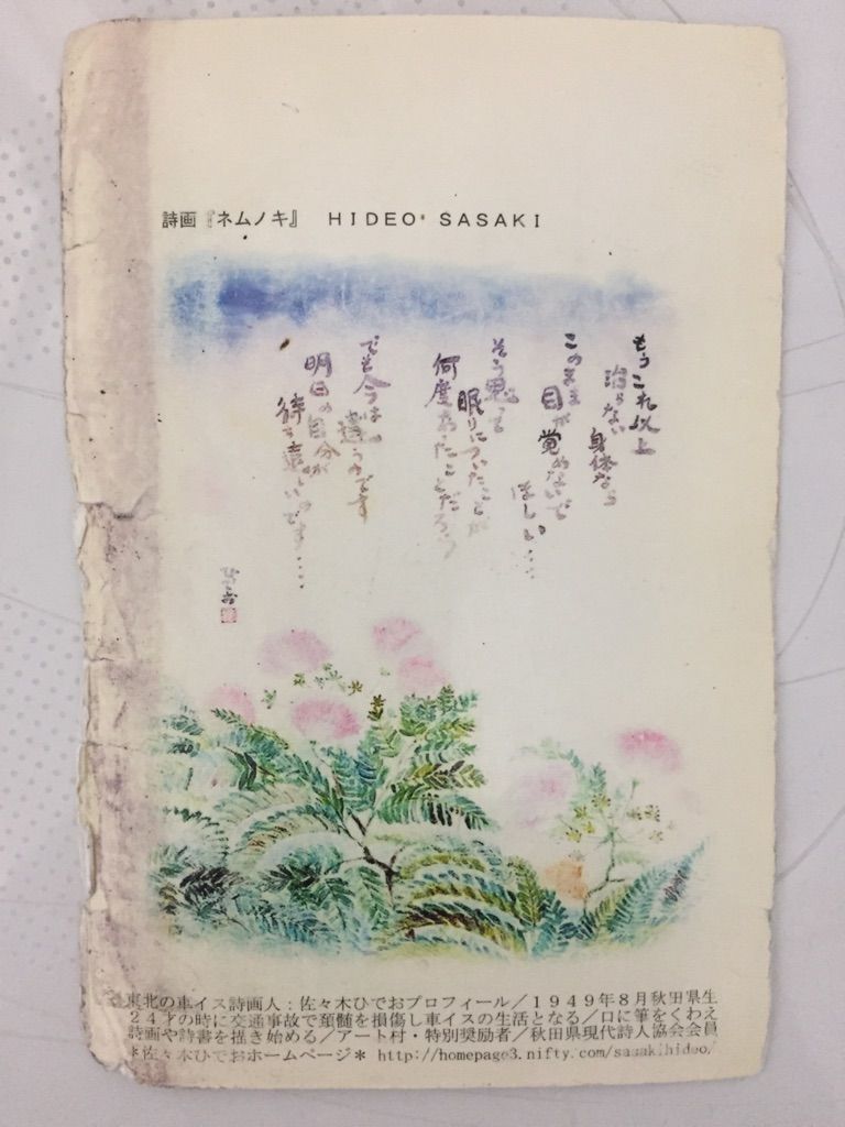郵便受けに届いていた一通のポストカード。誰からだろうと差出人を見ると、先日お礼状を送らせていただいた博多菓子工房「二鶴堂」橋本社長からのものであった。びっくりすると同時に文面を見て更に感動。「人生成功の秘訣は・・・」ある一文を見て思わず涙がボロボロこぼれた。しかも私が投函してから3日しか経っておらず、素早い行動と言霊に本当に心打たれた。更に驚かされたことがある。送られてきたポストカードは自社の広告宣伝を兼ねたものではなく、東北の車イス詩画人・佐々木ひでお氏の詩と絵が描かれたものであった。しかもこの詩と絵、手足の不自由な佐々木氏が口に筆をくわえて描いたものだという。もうこの小さなポストカード一枚に感動がぎっしりと詰め込まれていて、言葉を失った。作品の一つである詩のみご紹介させていただきます。もうこれ以上 治らない身体ならこのまま 目が覚めないで ほしい・・・・そう思って 眠りについたことが 何度あったことだろうでも今は 違うのです明日の自分が 待ち遠しいのです・・・・ひでお