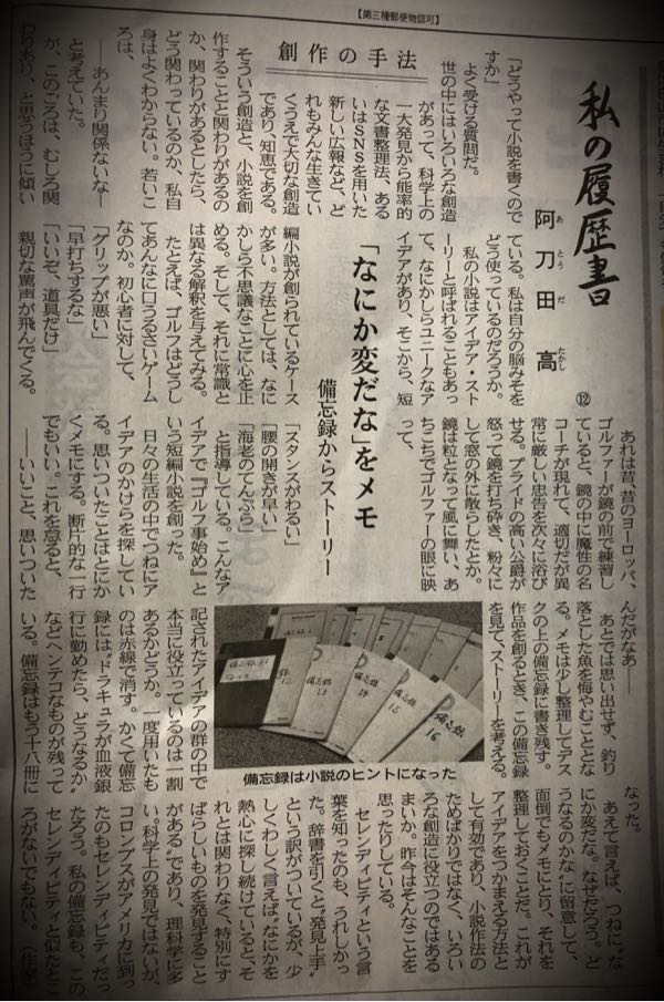 今月より日経新聞朝刊「私の履歴書」に連載されているのは、作家の阿刀田高氏。大昔、短編小説を読んだ記憶がある程度で、特に関心もなく読み飛ばしていた。が、第11話の「著述家に転身」「小説の独自性に苦心」といったタイトルに引き込まれ初めて読んでみることに。そして第12話「創作の手法」~「『何か変だな』をメモ」には更に興味が湧き一気に読破。ポイントは、「つねに“なにか変だな。なぜだろう。どうなるのかな”に留意して、面倒でもメモにとり整理」されていること。その備忘録はすでに18冊になるという。 全く次元は異なるが、私が日々更新しているブログを始めてすでに15年以上。元々は「超」がつくくらいに苦手だった文章を書く作業なのだが、誰からも束縛されない自営業という立場を、自ら規律正しい生活にするという意味合いもあって継続。今では朝起きて顔を洗ったり歯を磨くのと同様の習慣となってしまったが、毎日毎日書き続けるのはやはり大変な作業。パソコンに向かい今日は何を書こうかなというスタンスでは簡単に話題を思いつくものではない。常日頃から日々ブログ・ネタを意識し(笑)目に留まったもの記憶に残ったものをメモ並びにスマホで撮影するという心掛けが必須。毎日これだけ脳細胞を活性化させれば、認知症とも無縁でいられそう♪ 先ほどの阿刀田高氏の言葉「日々の生活の中でつねにアイデアのかけらを探している。思いついたことはとにかくメモにする。これを怠ると―あとでは思い出せず、釣り落とした魚を悔やむこととなる。」に大いに共感!!Written by 人力車の博多人力屋 以下のリンクをクリックして下さると、一票投票されて人気blogランキングに反映されるシステムになっています(一日一票)。毎日更新の励みになります。→人気blogランキング<起業・独立部門> ご支援クリックいつもありがとうございます!ただいま28位に。