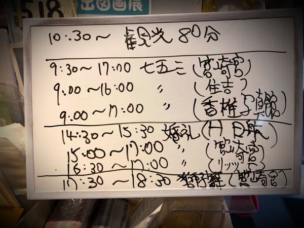 11月4日(日)櫛田神社並びに筥崎宮での結婚式送迎、筥崎宮七五三記念撮影、観光人力車3台稼働、写真館七五三送迎と複数の離れた現場に臨時スタッフ含めてわずか4名で対応。まさにマルチタスクの極み!!最もタイトなスケジュールは、13:30~14:50の観光案内後、櫛田神社前を出発し15:15に出発必須の筥崎宮挙式送迎への移動。しかも観光で利用した人力車をトラックに積み込み&積み下ろしの作業まで(-_-;)。櫛田神社挙式の待機中に駐車場まで(サンドウィッチを食べながら)徒歩で。トラックを観光拠点近隣コインパーキングに駐車しセッティングは完璧。 観光案内を終えて戻ってくると、案内途中にも一度携帯に英語で質問のあった外国人(後ほど台湾の方と判明)が。翌日ご乗車いただく予定だったが、今日可能なら今日乗りたいということになり、一人だけスケジュールの空いた若手スタッフに委託。このやり取りで更に時間が押してしまい、筥崎宮には参道までトラックで乗り付けバタバタとセッティング。記念撮影等で時間を引き延ばしてくださった介添えスタッフの方に合図を送り、何とかギリギリでセーフ♪翌週にも更に過酷なタイムスケジュール&ハードワークが待ち受けているが、万全を期したい。 Written by 人力車の博多人力屋 以下のリンクをクリックして下さると、一票投票されて人気blogランキングに反映されるシステムになっています(一日一票)。毎日更新の励みになります。→人気blogランキング<起業・独立部門> ご支援クリックいつもありがとうございます!ただいま42位に。