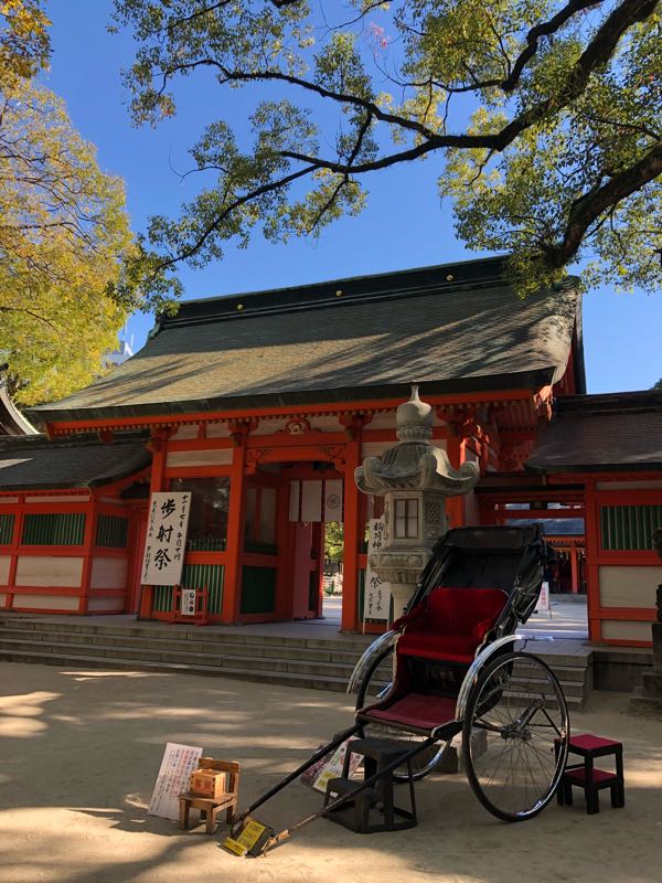 三連休最終日は、福岡市内中心部でホークスの優勝パレードが開催される日。そんな世間一般の行事と無縁の私は、七五三記念撮影営業最終日で住吉神社へ。さすがに人出は少なく午後2時頃で店じまい。神社二社(住吉神社・筥崎宮)の社務所へお礼に出向き、最後に観光拠点にセッティングした人力車の撤収へ。 私の到着直前、土産処に私を訪ねて来た、車夫バイト経験のある男性あり。特徴からほぼ目処をつけていたN君がご家族一同でご来訪。3歳の娘さんの七五三詣りで櫛田神社に出向いたついでに、自身もバイトで経験した七五三記念撮影に念願の我が子を。結婚式の際にもお世話になり、ご両親含めた貴重な顔ぶれメンバーでカンナちゃんのお祝いを♪わざわざのご来訪、本当にありがとう‼️お子様の健やかな成長を心よりお祈り致します♪ Written by 人力車の博多人力屋 以下のリンクをクリックして下さると、一票投票されて人気blogランキングに反映されるシステムになっています(一日一票)。毎日更新の励みになります。→人気blogランキング<起業・独立部門> ご支援クリックいつもありがとうございます!ただいま47位に。