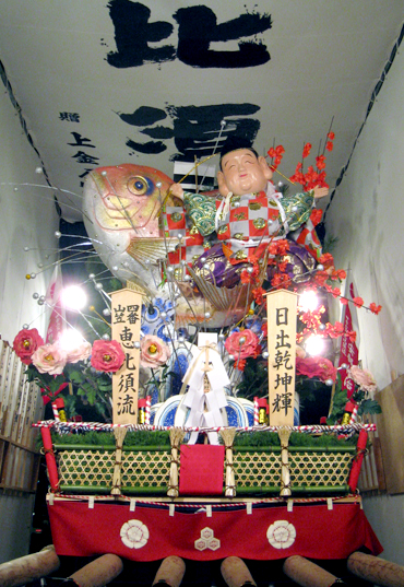 恵比須はイザナギノミコトの第三子、ヒルコノミコトと伝えられ、幼少のころは恵比須三郎として親しまれています。「日出乾坤輝」日は太陽、乾坤は天地のことです。太陽のような大きな鯛が恵比須神と共にもう一度お出ましをいただき、混迷の世界を輝かして下さることを大いに期待いたしましょう。