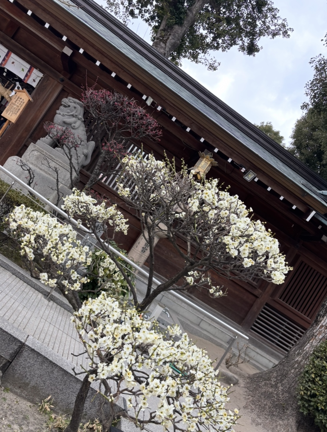 ◇櫛田神社境内の紅白の梅が開花。三連休最終日まで激寒予報だが、春までもう少しの辛抱。