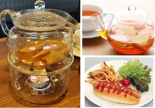 娘が頼んだアップルティ、二人はホットドックです。