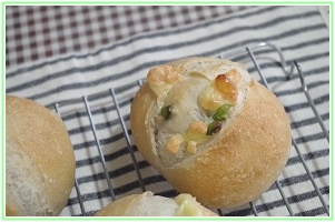 フランスパン生地のプチパンに、枝豆とチーズを入れました。