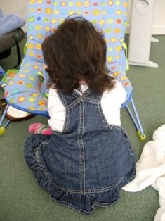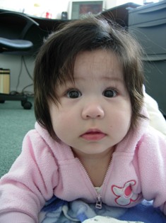 みなさんもご存知のように(?)、私はかなりの剛毛です。。。とにかく、すーごい髪の毛が多いんです!で、いつも美容院に行ったら、「極限まで、すいてください!!」ってお願いして、スカスカにすいてもらわないと、頭が重くて、えらいことになるんですよ。。。で、いつも美容院のお姉さん方は、「毛、多いですね~~」とかいいながらも、快く(ま、仕事だしね)すいてくれるんですが、だんだんだんだん「はぁはぁ」「はぁはぁ」「ふーっ」息が荒くなってくるんですよ!!!!そ、、、、そんなに多いですか???!!!で、シャンプーの時も、「はぁはぁ」「はぁはぁ」と、顔の真上で息されるんですね。。。こ、、この人もっっ!!!私ってやっぱりすごい髪の毛多いんだわ、、、、って、美容院行くたびに、ちょっとブルーになるわけです。。。が、しかし!!!私も「はぁはぁ」言う羽目になるとはっ!!!毎日ね、ベビーバスに誰かさんを入れて、髪の毛洗ってるんですがね、、、、、あんた、毛すごいって!!!!ほんと、生後7ヶ月??????なんかね、ミジンコちゃんの髪の毛洗うと、手がだるくなるんですよ(汗)すでに髪の毛がロングだから、泡流すのも大変だし、、(汗)私は、めんどくさがり屋なので、毎日洗うのやめよかな。とか、もくろんでましたが、洗わないと臭くなるし、、、、洗うと手だるいし、、、(汗)美容師のお姉さんの「はぁはぁ」ぶりに、ちょっと大げさな、、、、とか、思ってましたが、いや、やっぱ、大変です!!!!髪の毛多い人の毛を洗うのって!!!!今なら気持ちがわかります。。。(汗)それにしてもね、人に髪の毛洗ってもらって、気持ちいい~って思うの、大人も赤ちゃんも、一緒なんですねーー。だって、ミジンコちゃん、髪の毛洗ってあげると、うっとりして、目つむるんですよ!!!!!わかる! わかる! わかる!私も美容院で髪の毛洗ってもらってるとき、気持ちよくて、眠くなってくるもん!!!!毎日、そんな、ミジンコちゃんの恍惚の表情をみて、ぷぷぷっって噴出してしまってます(笑)↓ わたちの髪の毛の量はママ譲りです!
