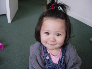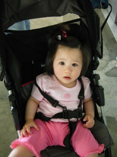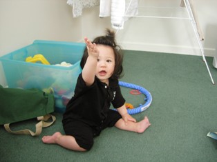 早いもので、生後9ヶ月になりました!うーん、、、さみしいけど、もう、赤ちゃん!って感じじゃなくって、子供、、、って感じになってきました。。こないだひさしぶりに、横抱きしてみたのね。母乳あげてたときみたいに、、、、んなら!!!!今じゃ、足がにょき~~~~~っと、私のひざから飛び出てるし、両手でささえないと重たいし、あ~~~~~片手で抱いて授乳してたのがなつかし~~~!!と、思ってしまいました。。。赤ちゃんってほんと成長するの、はやいなぁ。。。ところでミジンコちゃん、身長は71.5cm体重は8.6kgいたって普通。超超平均的です!!でもやっぱり頭のサイズは小さいみたいで、平均値以下。朝はあいかわらず、6時半~7時の間にちゃんと起きます。すごいねぇ。。あなたの体内時計、、(汗)ミルクを飲んだあと、ブロック遊び。 ↓朝9時に朝食。マッシュしたバナナにフルーツペーストをまぜたもの。 ↓11時からお散歩。30分くらいベビーカーにゆられながら寝る。 ↓12時半 ランチ ↓遊ぶ!!! ↓午後3時ぐらいにお昼寝。1時間~1時間半ぐらい寝ます。 ↓午後5時半ごろ 夕飯。 ↓夜7時ごろお風呂。7時半ごろ就寝。って感じです。最近は、ホフク前進みたいな「モゾモゾハイハイ」をするようになって、大好きな電気のコンセントやパソコンまで移動します(汗)これがかなりやっかい!「危ないからメンメ!」といって、取り上げると、泣いて怒ります、、(汗)あと、うつ伏せの状態から、体を起こして座ることも時々できます。相変わらず紙が大好きで、広告やらメモ帳やら、必ず紙のはしっこが、かじられてなくなってます。なんでそんな紙が好きなの????それがまた、おもろいことに、むちゃくちゃおいしそうに食べるのよね(笑)おなか壊さないでちょうだいよ(汗)でも、本棚から本を取り出して落としたり、CDを落としたり、、、は、超楽しそうにやってるので、思う存分やらせてます。で、夜、ミジンコちゃんが寝た後に片付ける。。。ま、片付けはめんどくさいけど、うちはあんまり物がないので、ちょいちょいっと片付けられるし、苦にならないかな。なにより、ミジンコちゃんが楽しいなら、ぜんぜんOK!あと、バイバイもできるようになりました!ま、はっきりとしたバイバイじゃないけど、なんとなく、、、、(汗)まだまだ練習が必要だな、、、、↓ どうだ! うつ伏せの状態からお座りできたよ!↓ 動けないよ~~(涙)私は密かに、「ミジンコちゃんの泣き顔フェチ」なんです!(笑)この、「くしゃおじさん」みたいな顔がたまらん!!(笑)かわゆすぎ!!♪