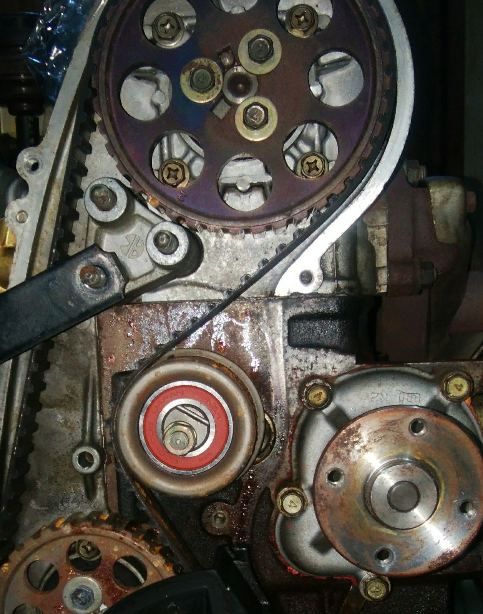 で、ボルトを外してウォーターポンプ・プーリーとタイミングベルトカバーを外した所↓