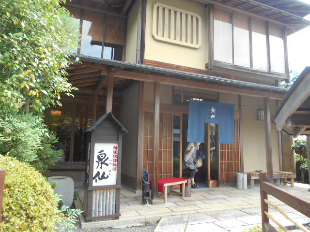 嵯峨野の精進料理泉仙さんでわらび餅、本わらび粉のわらび餅。美味しく頂きましたぁ。奥嵯峨野のお地蔵さんを見ながら歩きましたぁ。もちろん完食です。昔の庄屋さんのお家だそうですよ。屋根がぁ凄いですねぇ。明日はぁ、佐々木酒造の社長俳優佐々木蔵之介さんの弟晃さんに会いに行きますよ。テクテク。