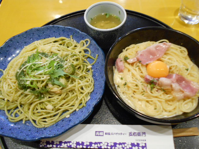 JR大阪駅ビル 毎日此処を通ります。スパゲッテー専門店五右衛門さんを訪問。おじさん昨日のラーメンに続き今年の麺類食べ納めです。しかも2皿頂きましたぁ。ああぁ、食べるのにぃー疲れましたぁ。カルボナーラ玉子のせ、和風ピリ辛小エビスパゲッテーです。完食してベルト1穴ずらしましたぁ。ふぅー。。ああぁ、疲れたぁ。御馳走様ぁ。 すみませんガサツでぇ。何かぁ。体重計に乗るのがぁ怖いなぁ。テクテク。
