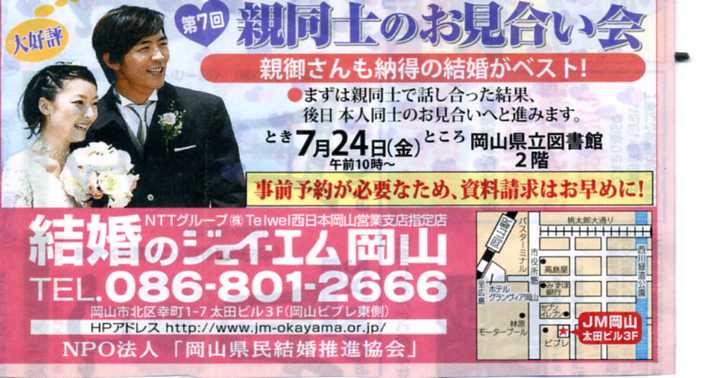 第7回の「親同士のお見合い会」を次のとおり行います詳細は次のとおりです。タウン情報岡山の広告記事をスキャンしたので裏面が透けて見えますね当初は男性の申込みが多かったのですがここに来て女性の申込みが増え逆転現象が起き女性が多くなりました男性の親御さんにも是非参加して頂ければと願っていますあと、2週間少々になりましたのでこれからが本格的な申込みになろうかと思っています息子さんをお持ちの親御さんも娘さんをお持ちの親御さんも親御さん納得の結婚のチャンスを拡大しましょうなかなか自分から動こうとしないお子さんの背中を押してあげましょう親同士の出会いのチャンス「親同士のお見合い会」を上手にご活用下さい資料請求お待ちしています 結婚のジェイエム岡山ホームページです ●あなたの街に住んでいる同郷のお相手探しに「結婚相談同郷ネット♪」へどうぞ ◆大阪・東京等に住んで居られる岡山県、広島県、山口県、鳥取県、島根県、香川県、愛媛県、徳島県、高知県出身者の方は 「中国・四国地方出身者結婚相談所」からどうぞ♪ ◆大阪・東京等に住んで居られる福岡県、佐賀県、長崎県、熊本県、大分県、宮崎県、鹿児島県、沖縄県出身者の方は 「九州・沖縄地方出身者結婚相談所」からどうぞ♪ ◆東京・大阪等に住んで居られる北海道、青森県、宮城県、秋田県、山形県、福島県出身者の方は 「北海道・東北地方出身者結婚相談所」からどうぞ♪