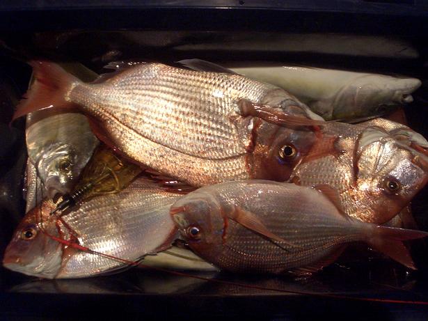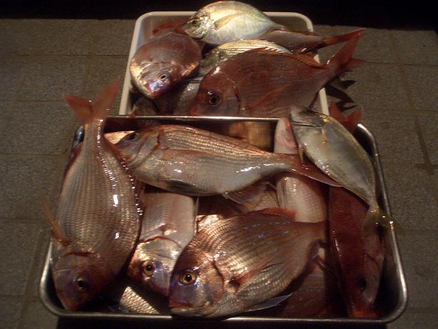 前回の腕に残る引き味の感触が忘れられず久里浜の五郎丸に行ってきました。偶然ですが左舷ミヨシに陣取っている人と話をしていたらなんとおしょうさんの師匠であることがわかりました。思わず握手です。そして今日の下浦沖ですが前半はイナダ、イナダのオンパレード。たまーにハナダイといった感じでした。中盤絶好調の時間もありました。絶不振の時間帯なんでだろうなぁと思っていたらなんのこたあない。ハリが2本曲がっちゃってたじゃないですか。これでは釣れません。あの30分のロスタイムは勿体無かった。シャクッて竿が一瞬とまりキュンと当たりが来る瞬間がたまりません。のけぞる感じであわせ。しっかりフッキングさせるまでが楽しいのです。それでも都合10回はハリに掛かったのにバレてしまいましたね。お隣さんはカワハギ、マトウダイを釣ってました。マトウはおそらくヒイラギが掛かってそれに食ってきたのだろうとのことです。ウィリーはほんとうになんでも釣れます。ジョンリーも今回生まれて初めてヘダイを釣りました。チヌに雰囲気が似た魚です。今回は前回より釣果は伸びました。 ハナダイだけで25匹です。あの絶不調の時間帯にハリ点検をもっときちんとやっておけば30台は行ったと思います。悔しいけど釣りとはそんなものです。今回はおしょうさんの師匠がトップで48匹、次が26匹、その次の成績でした。まあ悪くはない釣果です。 たまにカイワリも混ざりました。イナダも10本以上。鯛はやっぱりあの引きがたまんないですね。あの引き味あうと病みつきになります。