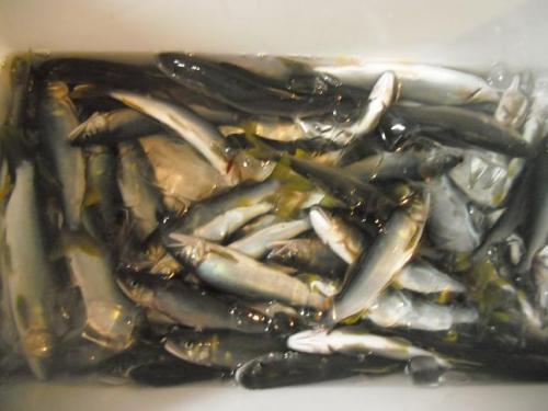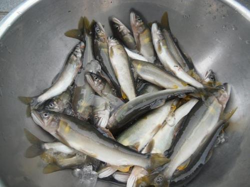 富士山鮎との出会いを楽しみに『歌舞伎鮨』にてオトリ鮎購入。巨鮎ハンターさんは既に昨日の連絡A地点にてスタンバイ。ジョンリーはいつものB地点にてスタート。オトリ鮎が水に慣れていなかったのか、根掛かりで瀕死状態。「ヤベ」2匹目は慎重に泳がし。「カツーン」ヤリイ!!!竿は今年初トライとなる5.5→6.0メートルのズーム竿。軽い。195gも軽いけどこちらは138g。快適です。一発目が取れると後はしめたもの。入れ掛かり。怒涛の入れ掛かり。目印がふっ飛ぶ。鮎釣りはこうでなくっちゃ。型が18センチと揃っています。これも嬉しいのです。やはり大きくなると引きが違います。渓流竿は胴に乗るので抜きにちょっと苦労しますが問題ありません。しかし・・・抜きに困って時々バラシます。掛かり鮎があっという間に瀬に行ってしまうと抜けないのです。ドンブリも1回ありました。クソー。人がいる場所は近寄ってくるので、どんどん移動します。まさに渓流釣りのポイント探しです。狙ったポイントには鮎が必ずいました。水が綺麗なので泳がすと鮎が追ってくるのが見えます。元気なオトリを使えば一発です。朝から夕方近くまでズート釣れ続きます。「なんていい一日なんだ」なんか今日はいいことありそうだなあ。・・・と思ったのもつかの間。皆様ご期待の大失敗を披露させていただきます。やんなきゃいいのに深い淵の岩盤に鮎がいると思って流したら3連発。調子に乗って泳がせていたら例によって根掛かり。はずそうと思って入ったら淵に落っこちゃって「ヒエーー」アップアップ。泳ぐ羽目になりました。当然ですが鮎はブッーン。全身ずぶぬれです。サビー!!!動転していたのでしょうか。仕掛けを作り直す時、確かあったはずのハサミがない。目印を切るハサミがないのです。何度探してもありまへーん。おかしい。確か収納ポケットに入れてさっき出す時も確認したはずなのに・・・しゃあないので歯で噛み切って目印を調整。美しくない仕掛けです。・・・とあきらめていたら目の前にあるじゃないですか。あんなに探したのに・・なぜ見つからなかったのか?不思議、不思議です。(注意力散漫だからだろ)歌舞伎鮨さんのところで写真撮影です。今日は全体的に好釣果で50~60匹台がアベレージだったとの事です。巨鮎ハンターさんも70匹近く釣れて大満足の日だったとの事です。めでたし。数えてみたらジョンリーも76匹いました。数に拘るならもっと釣れたのですが引き舟に入らないので4:30で納竿としました。それでも一番遅く釣っていたほうとの事です。さて今日は更に2つ嬉しいことがありました。一つ目は大渋滞の中、家路に着くと最近知り合った中国人の方が四川料理をたくさん作ってくれていました。山椒と八角の香りが部屋に充満していました。二つ目は図書館司書入学の合格通知が舞い込んできたことです。3大学受けて、既に2大学落っこちていたので、さすがに楽天家のジョンリーも「ヤバイ」と思っていたですが、最後まで必ず合格する。願いがかないました。楽しい話は読む人も元気になれるのではないかと思います。いやあ、何でもそうですが、必ず釣れるとか、合格すると思って行動することはとっても大事なんですね。