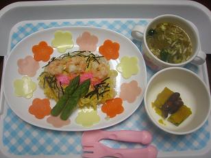 3月3日のお雛様当日は、パパが出張で留守でしたずっと雨が続いて家に閉じこもっていたうえ、ちょっと寂しい一日でしたがお食事だけでも楽しくママの手作り料理は頭の中でイメージしただけで何も参考になるお料理の本がなかったしネットで調べることもなく…。ちょっとやる気が足りなかったかなこんな感じで出来上がりましたちらし寿司は、周りにお花型のチーズ・ハム・にんじんを飾り、ごはんの上には、しらす、タマゴ、桜でんぷ、のり、えび、アスパラがあります。あとカボチャの煮付けと手作りアズキ、しじみとほうれん草のお味噌汁です。りーちゃんは、モリモリと食べてくれましたお雛様を飾るのは今回で2回目です。これからもりーちゃんの健やかな健康を願って