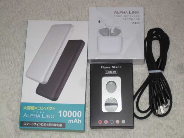 モバイルバッテリー、Bluetoothイヤホン、3in1ケーブル、携帯スタンドでした。