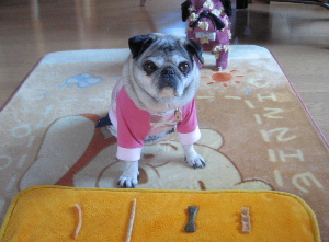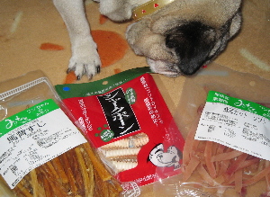 ★ ~~~ ★ ~~~ パ グ イ ズ ~~~ ★ ~~~ ★お待たせいたしました♪(?)第3問目、最終問題です♪どなた様も頑張ってくださいね~w先日、歯石を取って、歯を抜いてw すっかり歯の調子が良くなったなつめです。おかげさまで、食欲がもどっただけではなく、今までイヤがっていた硬いものも 喜んでカミカミするようになりましたそこで 3問目は、「なつめがカミカミしたのはど~れ~???」 クイズなつめの目の前にトリーツが4つあります。 ▽^。^▽」」」」~1 2 3 4第 1 のコース ブタ耳スライス クン 第 2 のコース 棒型チューインガム クン 第 3 のコース ボーンミント クン 第 4 のコース 山切りガム クン 最初に噛み噛みしたトリーツはどれでしょうか???コース番号で答えてね(^^)ノ★ ~~~ ★ ~~~ ★ ~~~ ★ ~~~ ★ ~~~ ★「パグイズ」は、2月1日 と 3日 にも出題してます。全部で3問。解答は全部まとめてでも受け付けます私書箱(メール) に ポトンしてくださいね。締め切りは、2月7日(水)結果発表は、2月8日(木)を予定してます^^全問正解した方には、心ばかりのプレゼントを用意♪参加していただける方は・・・ 1、いつも遊びに来てくれるお友だち 2、初めて来てくれた人で、日記に対するコメントを残してくださった方 ※ 楽天ブログ以外の方もOK 3、全問正解の際にプレゼントの発送先を教えてくださる方皆さんのご参加お待ちしてます~v(゚-^*)★ お知らせ ★マナーちゃんステッカー(防水加工) 数量限定、無料配布中です※ バッチは終了しました。ステッカーはまだありますので 遠慮なくどうぞ (^^)この運動を広めていただきたいので、是非宜しくお願いします。詳しくは 15日の日記 を見てください^^マナーちゃんグッズで フン放置撲滅運動 私はフン放置はイヤ!!