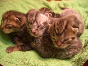 14日の夕方に6匹仔猫が生まれたのですが最悪なことに翌日15日、1匹の命がなくなってしまいました。よく親猫がつぶしたり玉をとってしまって殺してしまうって聞いていたのに。就寝してる間に気づいてあげられませんでした。毛布を敷いてる場所から今回の仔猫は生まれて間もないというのにちょっと離れた場所に出てくるくらいすごく早い発達ぶりだったのでバリケードしてた隙間から出てきてくわえられ玉をとられたりのなんらかできっと亡くなったんだと思います。私自身気づいてあげられなかったことに反省し、また悔しさでいっぱいでした。うちの人と日付は16日に変わった朝方なくなった仔猫を川に流しに行きました。涙でいっぱいになり手をあわせゴメンねとしか言えませんでした・・家路に着き、うちの人が大きな声で私を呼ぶのでまた何かあったかとびっくりしたら「6匹いるよ。数えてみて」「え、1匹亡くなったから5匹じゃない」でも数えたら6匹いるのです。なくしてしまってから仔猫の数を数回、数えてましたが15日夜から16日に日付が変わったあたりの間にもう1匹生まれたようなのです。こんなに時間がたってまだ生まれるのかとびっくりしましたがきっと新しい命を神様が授けてくれたのだねと顔を見合わせました。