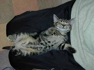 チャコ生後4ヶ月くらいの写真。私の股の上で寝てます・・こんなお茶目で可愛かったの↓今は1歳4ヶ月。うちに来て2回目のお産を迎えます。ビーチクが出てるでしょ↓4/14夕方になりチャコがみゃーみゃー鳴き出しそわそわし始めました。ヤ、ヤバいうまれるんだ。猫ちゃんのお産は明け方が多いのにっ仕事に出かけないといけないし、お産に付き合ってあげれなくてゴメン申し訳ないと思いましたが家を空け2時間ほどして急いで様子を見に帰ってきたら6匹の子猫が生まれてました!!やっぱりおなかすごくパンパンに大きかったものナ・・6匹も生んでご苦労様男どものジュジュとキキも心配そうに付き添って見守ってます生んで数時間後のチャコ↓