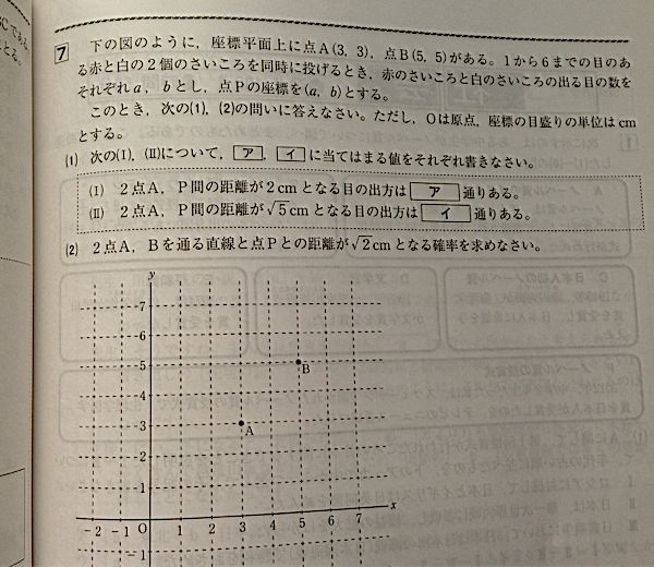 あと数日で本試験となりました。現在、今日の授業で使うプリントをつくっています。英語はなんといっても配点の大きな大問5の長文です。ここは決め技みたいなものがあるので過去問(生徒が持っているものではなくて平成15年〜20年の過去問)を使って、何が問われて何をどう答えるのかを最終確認したいと思います。なんとなく「まとめ」としてつくっているわけではなくて、かなり真剣にピンポイント攻撃で大量得点GETを狙います。ちなみに昨年の数学では、確率と座標と三平方の定理が組み合わされた問題が出題(下の写真)されていますが、同じ考え方(2回振ったサイコロの目と三平方の定理)使う問題が平成15年にあります。昨年の問題は、わかる人には簡単だったのですが、県立入試は、こういった分野を複合させた問題が大好きです。各新聞の試験講評を読むと「教科書に即した基本的な良問である」というコメントばかりですし、教科書を逸脱しているかというと全くそんなことはないのですが、こういう問題が学校の定期テストで出ているか、学校で練習されているかというとそのような機会は皆無だろうと思います。平成15年の確率の問題