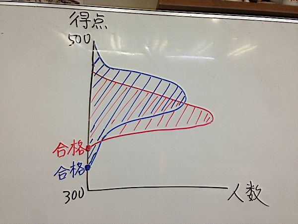 全国的にいえることだと思うが、地方の古くて小さな町にある旧制中学系高校(昔は偉い人を多く輩出した高校)は、学校全体としての進学実績はもうそれほど出せていない。ただ、ごく一部の生徒は相変わらず難関大学に合格している。地方の伝統校、とりわけ県庁所在地以外の市町村合併前人口が4万人程度のところにある伝統校は過疎化と少子化の両方との戦いである。そうしたなかにあって、今日の日経新聞の地域版にも出ていたのだが、茨城県のつくば地区は、つくばエクスプレスの開通で人口が急増しており学校の整備が追いつかないらしい。水海道を境界線にしてその東西での段差は深い。水海道は街の中をみればわかる通り昔日の繁栄は遠い感じだけれど、水海道一高という高校は、この東側や南側の生徒に支えられて人気が続きそうである。うちの塾のあたりは、県の人口動態をみると、あと10年もすると中学生が激減してしまうのだが、つくば方面の隆盛の余波で、暫くの間、水海道一高を受ける生徒には厳しい状況が続く。茨城にかぎったことではないが、青い斜線のような合格者分布の高校と赤い斜線のような合格者分布の高校がありそうである。小さな町の伝統校は青い斜線である。青い斜線全体がズルズルと下に降りるようでは伝統があっても衰退する。都市化している場所の高校は赤い斜線。似たような点数での激戦となる。