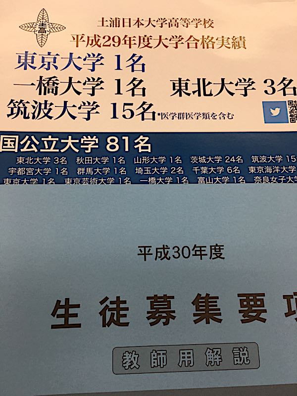 土浦日大高校の入試説明会に来ました。昨日も受験セミナーでつくばに来ていて連日、毎朝、東方面に車を走らせています。 国立大学の進学者数をみると上位校についても全体数についても下妻一高に酷似しています。 ただ、この一橋大学の合格者の方が下妻市立の中学校の生徒さんというのが下妻一高としてはみすみす「取り漏れ」をしているような気がしてなりません。私の記憶に誤りがなければ3年前の東大文三の生徒さんも確か下館南中学校で本来は下妻一高ががっちり確保すべき能力であるはずなのになと。 下妻一高の場合、東工大や京大の理系には毎年誰かしら合格していると思うのですが、一橋大学は非常に長いこと合格者を出していません。 土浦日大の場合、毎日、きちんと学校生活を送り、真面目に取り組んでいれば日大はほぼ確実であり、成績が伸びれば他の国立、私立に行ってもいいというのは魅力的です。 日本大学というのは、学部にもよりますが、県内の◯◯一高クラスから合格するのはなかなか難しいというのは知っている人は知っている話で、その辺り、戦略的になかなか上手だと思うのです。 県内各高校別の日大受験者数対合格者数を明らかにしていて、これを見ちゃうと「高校から日大に来てしまってもいいかな」という気持ちに傾くことも少なくないかもしれません。 また、併願だと進学クラス(最も入学が易しいコース)でも水海道一高になんとか受かるというレベルだとやや合格するのが難しく、単願にしてしまえばほぼ確実というのも、これまた線引きとしては非常に上手、受験させる方からすると実に悩ましいところです。 あとは学費と時間という問題になってくるかなと思います。 単願入学者も多く、また千葉県からの進学者が多いというのも特徴で、このご時勢にあって、お金を出せる人も少なくないんだなあというのをしみじみと感じます。 図書館は一度見学してみたいですね。資料を見るかぎりでは素晴らしい。 なお、併願入試の試験範囲は数学の「三平方の定理」、理科の「天体」、社会の「公民の経済、国際」の各分野は除くということで、進度の遅い中学校にも配慮した形になっているようです。(現在の中3の学年から土浦日大も併願入試に関しては5教科に変更になりました。)