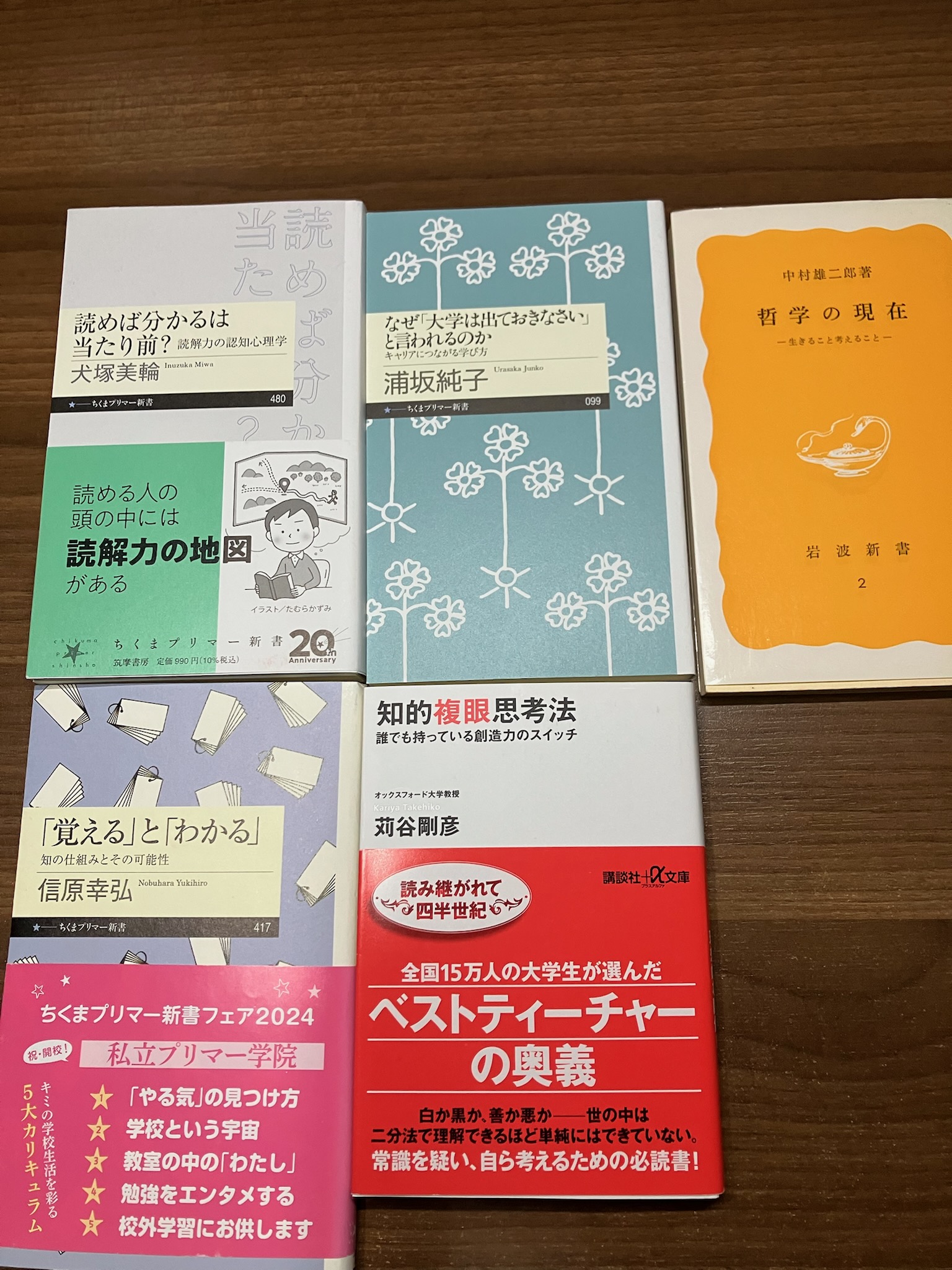 こちらのブログで、以前一度触れましたが、ついに当塾のホームページがお亡くなりになったようです。(ぷららのHPを利用していたのですが、利用者が少ないようで、2025年3月でサービス提供が終了しました)ご愁傷様です。ということで、現在ホームページがない状態です。このご時世、ホームページのない塾も珍しいですね(しんみり)。なお、新しいホームページは現在制作中ですが・・・と、言いたいところですが、全く何も準備しておりません。ぴーんち。というわけで、新規お問い合わせの方は、当ブログの画面右横に授業料などの詳細が書いてありますので、当面はそちらを参考にしてください。パソコン画面から見られます。iPhoneからパソコン画面を見る場合は、いったんiPhoneを机に置いて、ノートパソコンを持ってきて、パソコンの電源を入れ、パソコンの画面をiPhoneの写真アプリから覗いてください。また、アンドロイドの場合は、いったんアンドロイドを置き、パソコンのある部屋に行き、パソコンの画面を開き、パソコンの画面をアンドロイドから覗いてみてください。春休みのため、妻と子供達が妻の実家に帰省中。そのため、一昨日の日曜日は読書三昧でした。ちくまプリマーの3冊は読みやすいですね。中学生はちくまプリマー新書を週に1冊は読んでほしいです。必ず興味があるタイトルがあるはず。→こちら(2025年4月2日現在497冊です)また、『知的複眼思考法』と『哲学の現在』は再読。前者は中学生にもおすすめです。後者は難しいです。しかし、岩波新書の青版と黄色版は名作が多いですね。中2の頃に「知的生産の技術」を読んでから、岩波新書にはまり、夜(というか深夜に)ずっと読んでいました。勉強そっちのけで。※『知的生産の技術』は現在ではほぼ役立つことはありませんが、自分にとっては大切な本です。夜は野球中継を見て、それが終わったらラジオ(三宅裕司のヤングパラダイス)。その後は、フジテレビの深夜放送(奇妙な出来事とかIQエンジンとかやっぱり猫が好きとか)。その後深夜に岩波新書という流れでした。当然、朝は起きられず、午前中はボーッとしていた記憶があります。塾生の皆さんは真似しないようにしてください。