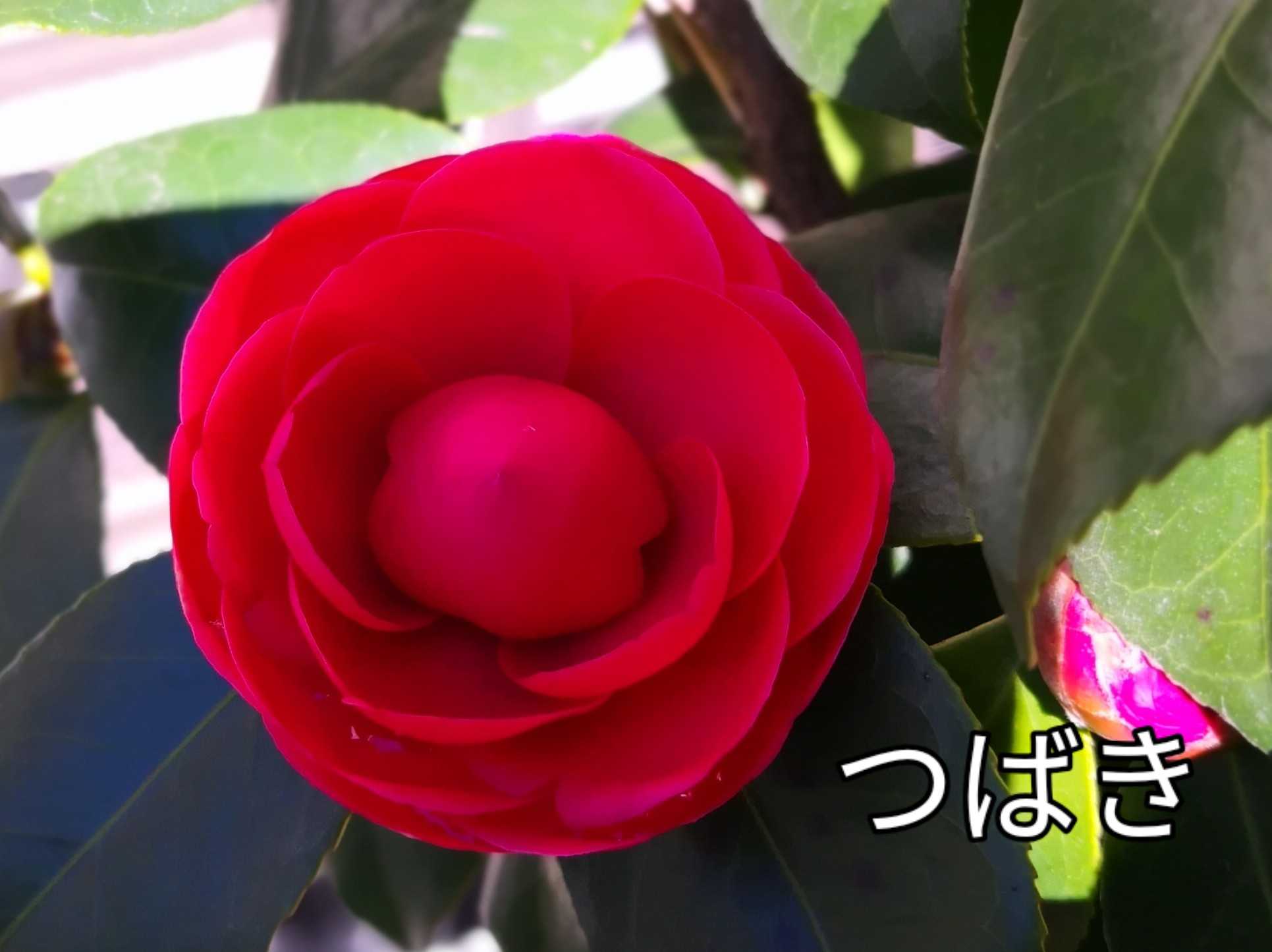 自宅前の植え込みに真っ赤で丸い形のツバキが