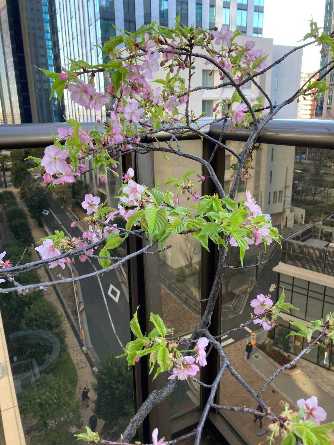 近所の友人のマンションのベランダで河津桜が🌸咲き