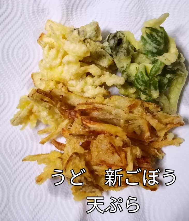 うどは短冊切りにして人参と玉ねぎとで天ぷらに