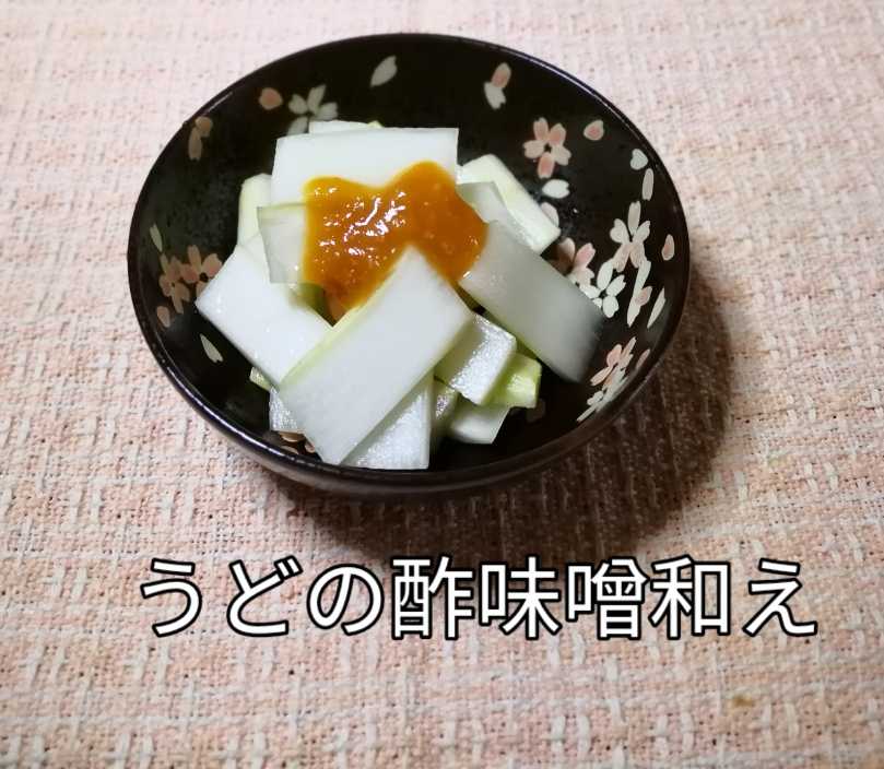 飲みながらうどの酢味噌和えと天ぷらを肴に