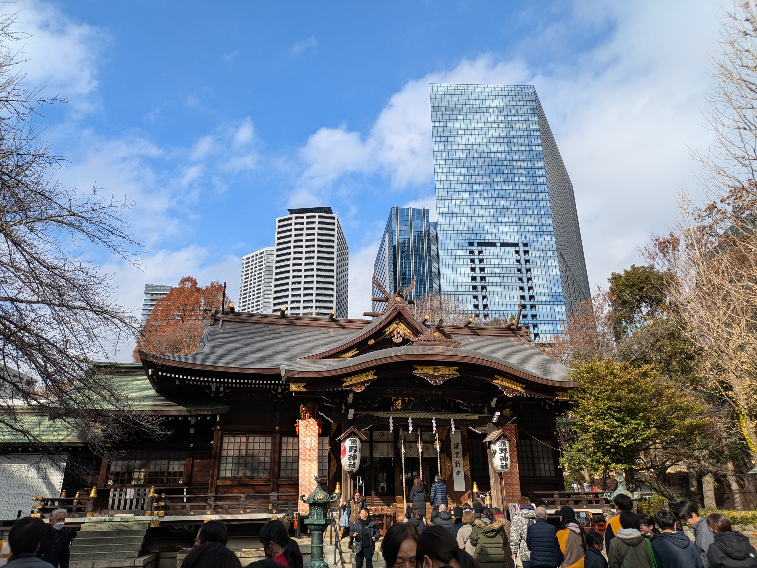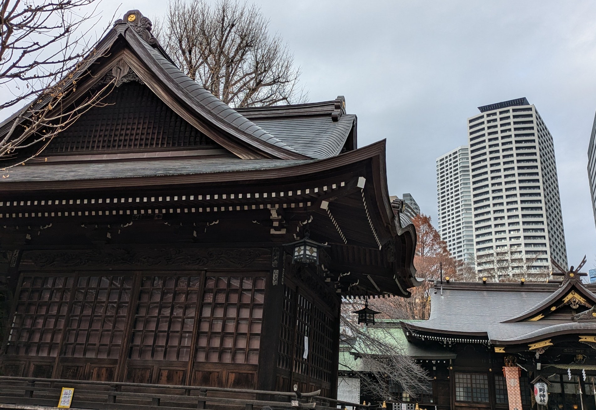 歴史を感じるお神楽殿と熊野神社本殿と背景には高層ビルが見えます