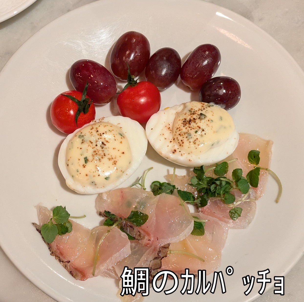 ラビオリ 鯛のカルパッチョはオリーブオイルをかけて頂きました