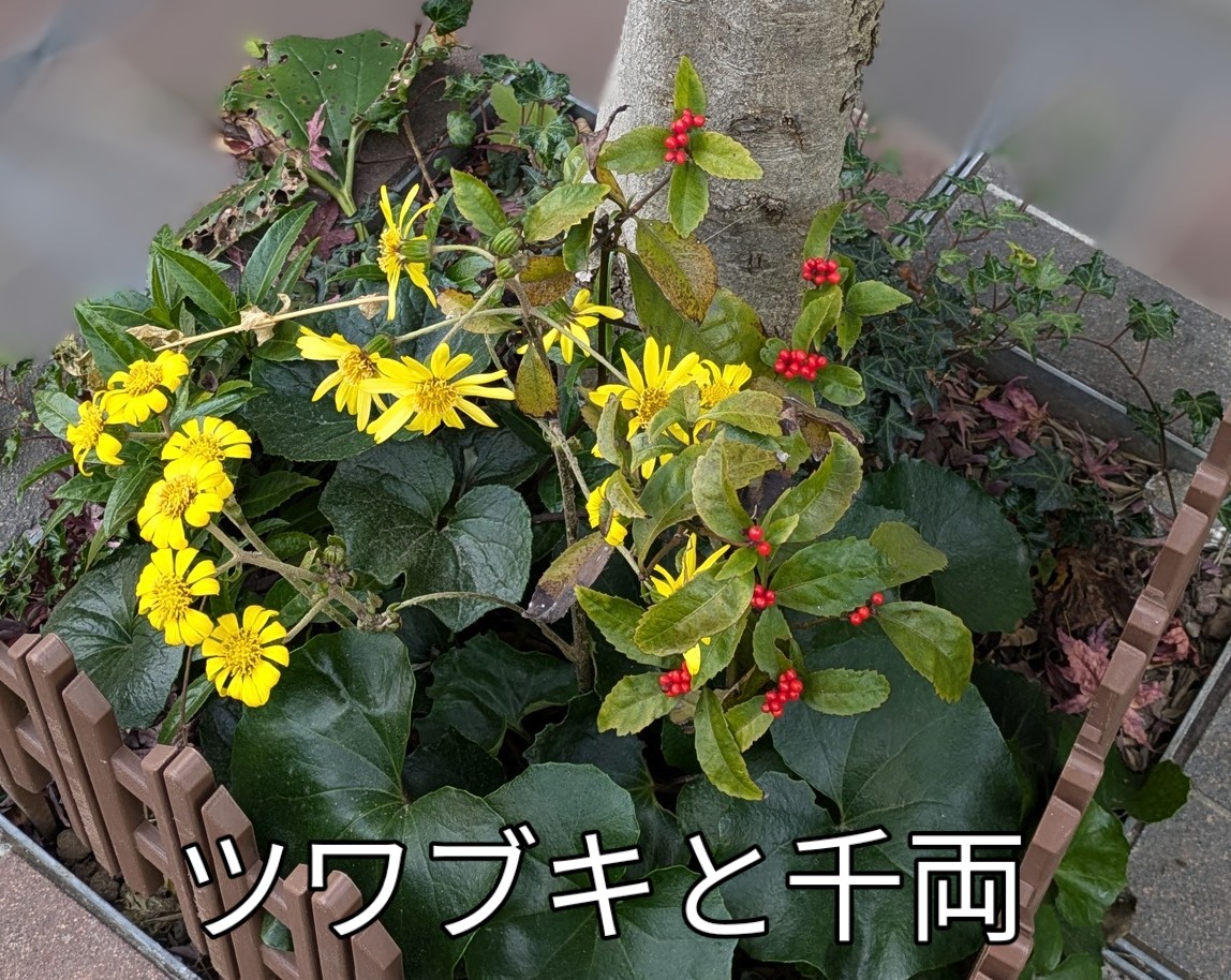 マンションの前の花壇にツワブキと千両の花が植えてありました