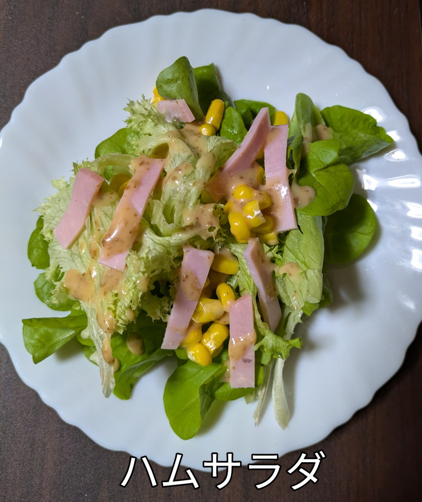 ナスカレーに ハムサラダを  束のサラダ菜を使いました