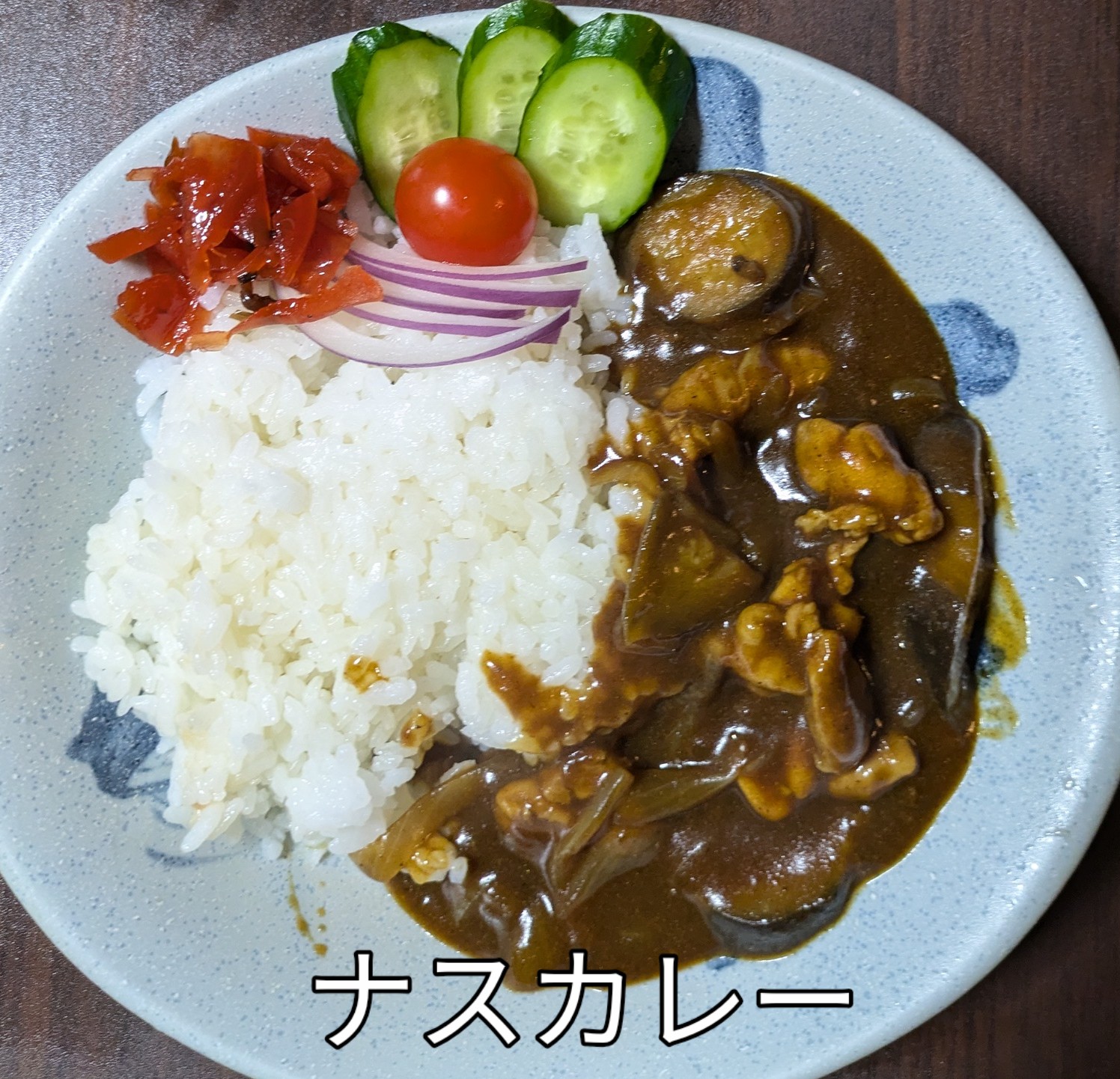男料理(昼食)ナスカレー  ナスと鶏肉 福神漬けを添えました